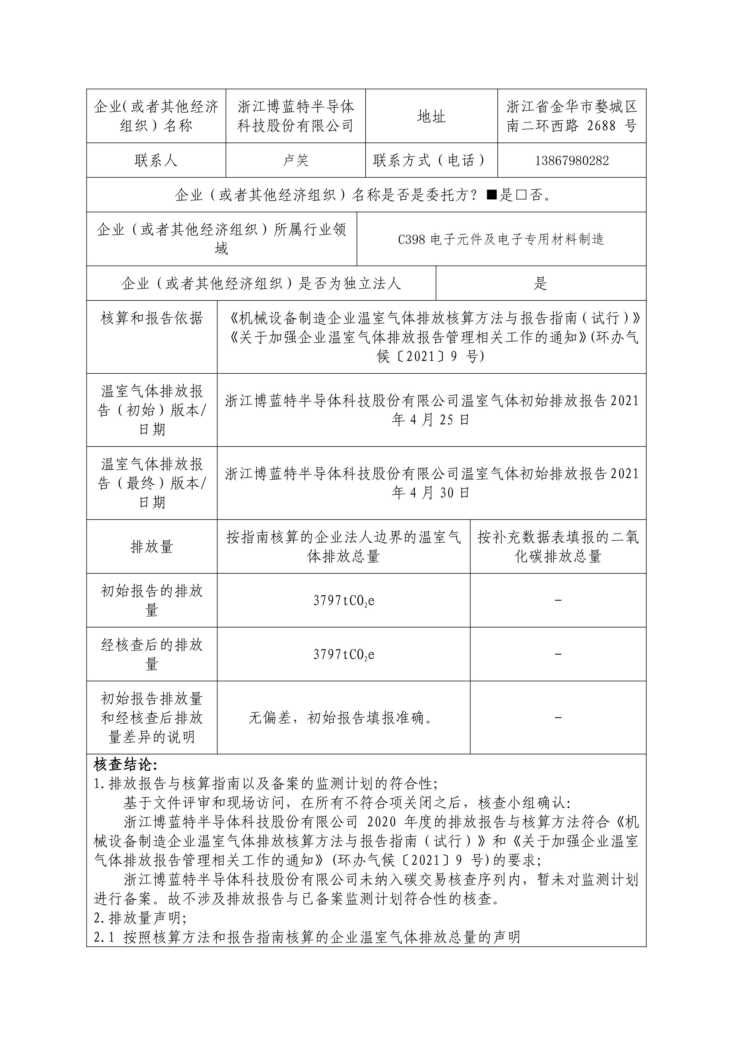 2020年博藍特溫室氣體排放核查報告